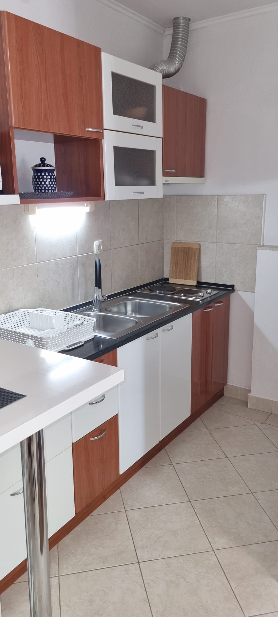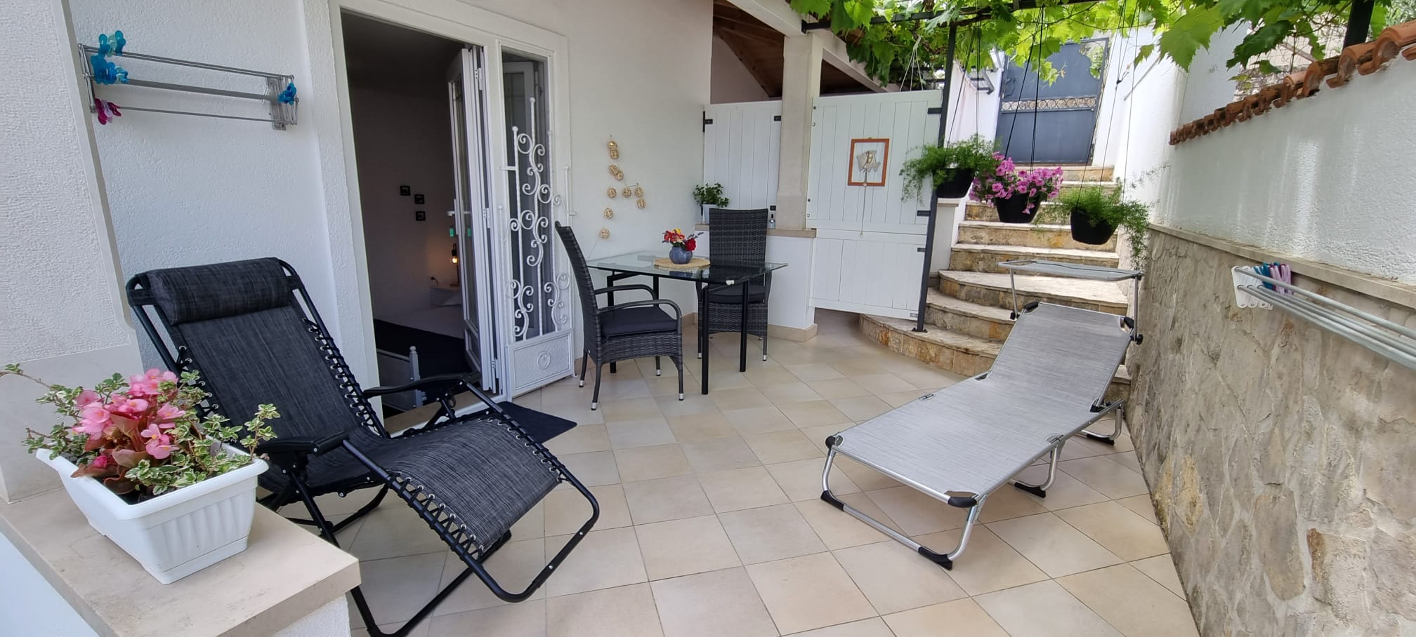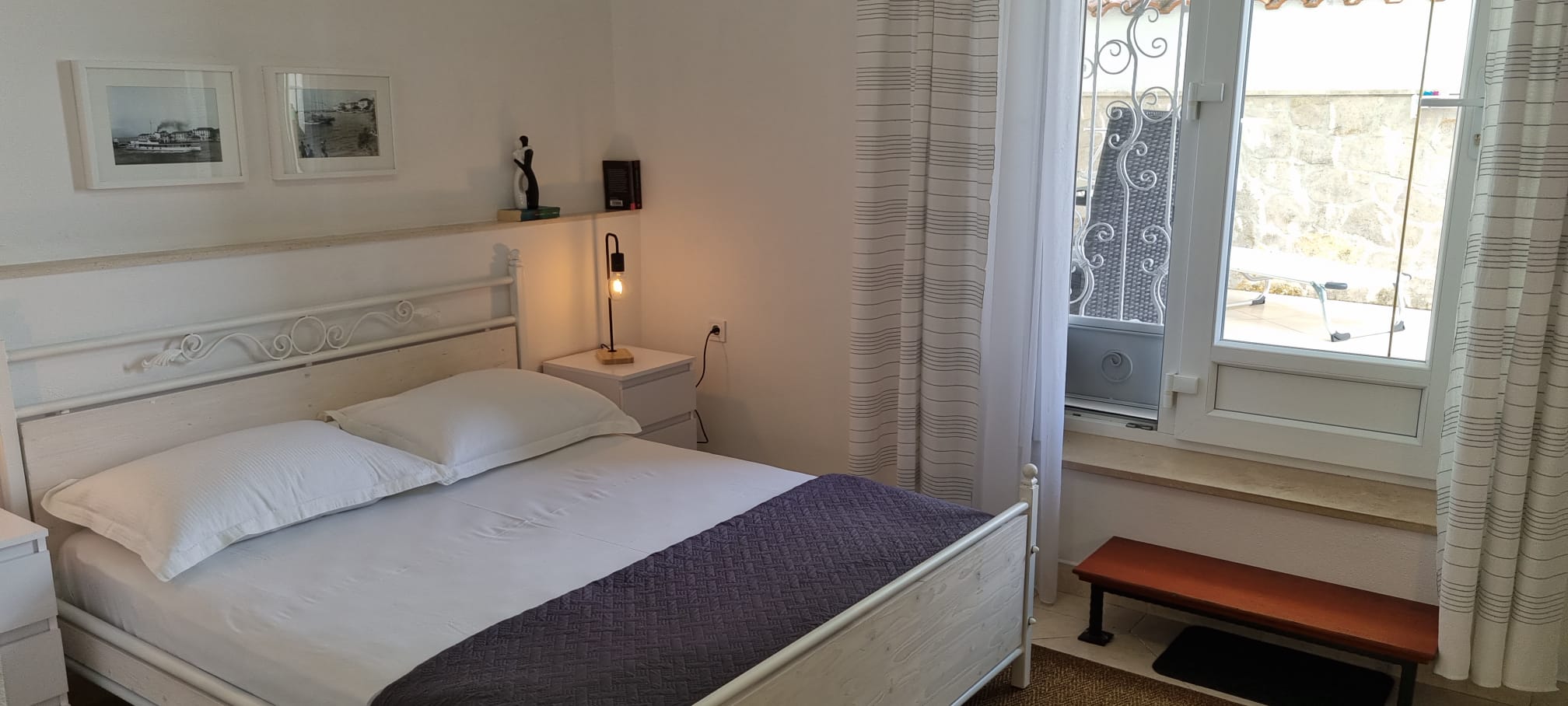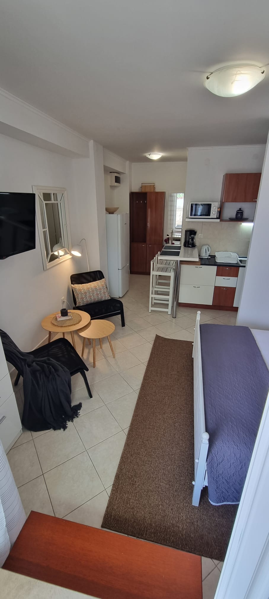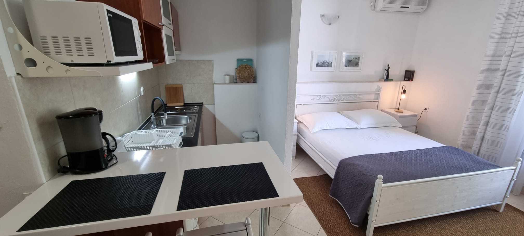 This comfortable, air-conditioned studio is ideal for two guests. It features a compact kitchen, a private bathroom, a washing machine, and a sea-view terrace – perfect for relaxing after a day of exploring. Simple, practical, and well-equipped for a pleasant stay.